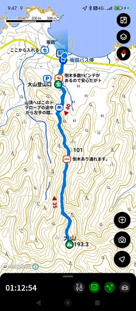 安房・大山 ★登山口までは道が狭くて入れずバス通りの脇に路駐。民家の脇から登山口の看板があり入るが登山道はあまり良くない。往復1時間位なのだが山頂近くに立派な新しい道路があったがまだ工事中で入れないようでこの道は地図には載っていない。